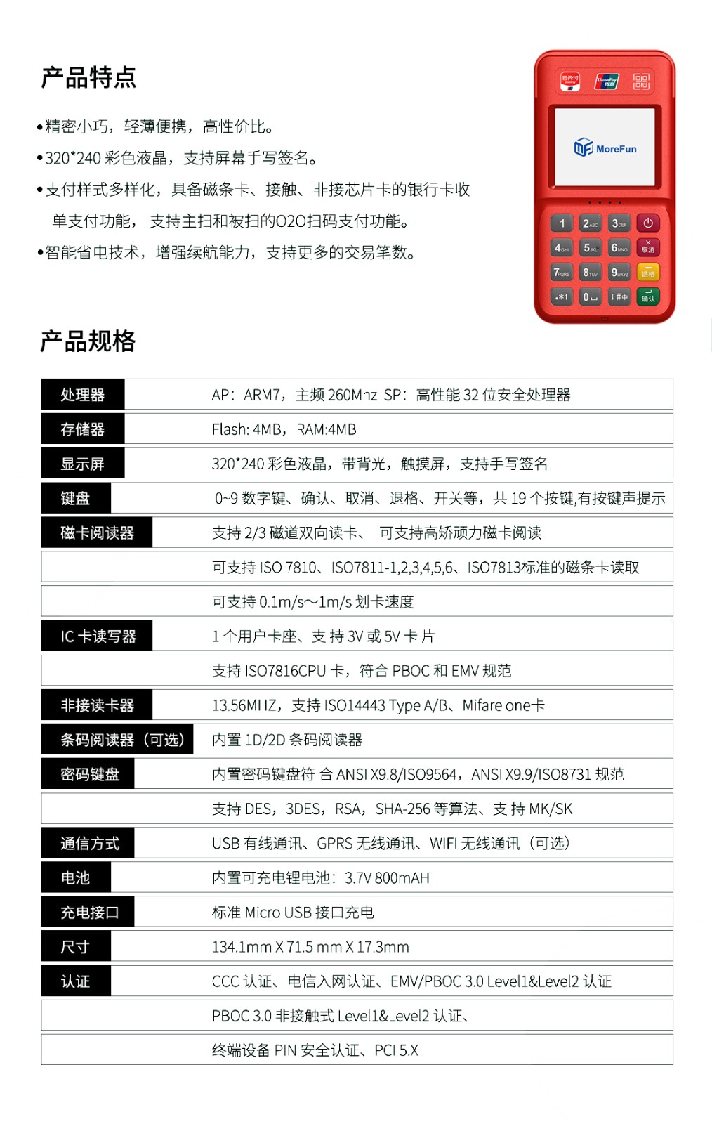 首页>>湖南产品中心>>湖南手持无线POS 湖南电银支付-4G+扫码枪 高配版 * 性能优越:32位高性能ARM11安全CPU;整机通过业内更先进的PCI PED4.X 安全认证及国内受理终端PIN输入设备安全评估检测认证,多项措施保障金融交易的安全;* 时尚外观:外形小巧携带方便,高抗跌落性能、宽工作温度、防水防尘设计、外壳坚固耐刮、户外携带式作业更加耐久可靠。* 通讯备份:支持2G-3G扩展;* 超长续航:3.7V-800毫安稳定续航能力,智能电池管理保证持续工作18小时,待机72小时。 标准配置 返 回